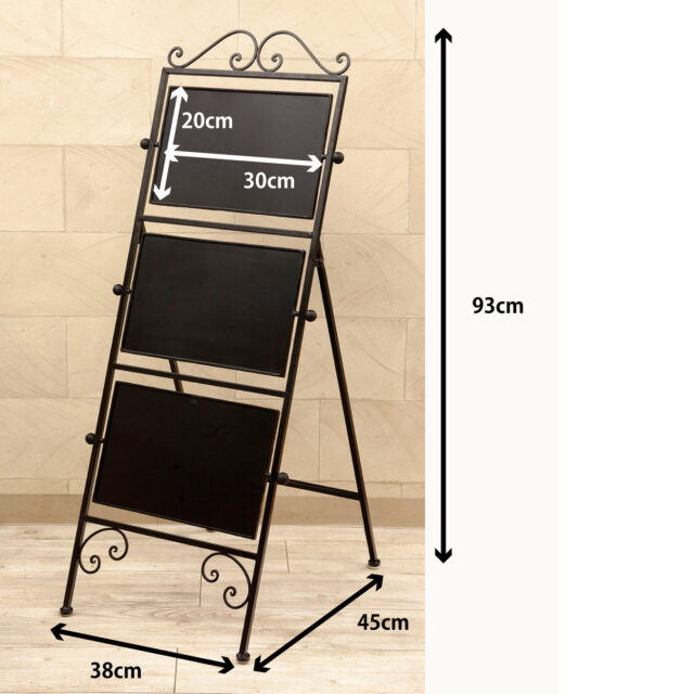 コベントアイアンブラックボードスタンド コベントアイアンブラックボードスタンド (HQ5193) お店のメニューボード等にいかがでしょうか。 ボード3枚がそれぞれ回転するので両面使えます。 鉄製ですので、マグネットボードとしてお使いいただいてもかわいいですね♪ [サイズ]W.38xD.45xH.93cm [ボード1枚のサイズ]約W30xH20cm(ボード1枚枠なし:約W29xH19cm) [重 量]約3kg ※メーカーより直送 FacebookXBlueskyHatenaCopy コベントアイアンブラックボードスタンド 在庫状態 : 売り切れ ¥11,000(税込) 只今お取扱い出来ません